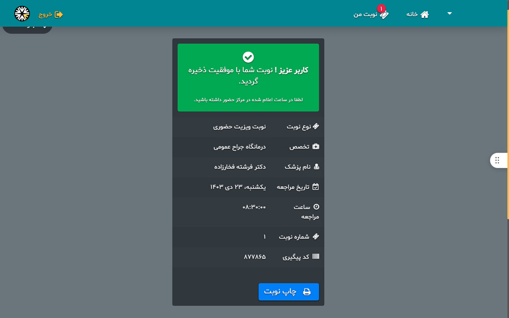 7 _ در انتها کد پیگیری خود را یادداشت کرده یا می توانید از طریق گزینه "چاپ نوبت" برگه خود را پرینت بگیرید .