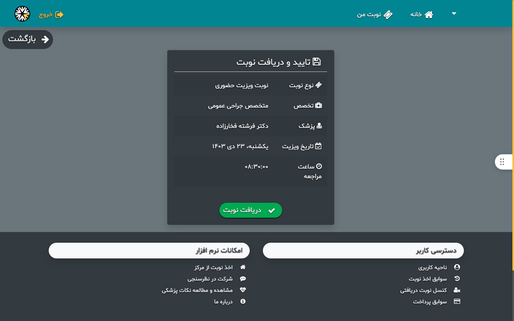6 _ در این مرحله، نوبت درخواستی شما در صفحه نمایش داده می شود، در صورت درست بودن، گزینه "دریافت نوبت" انتخاب نمائید.