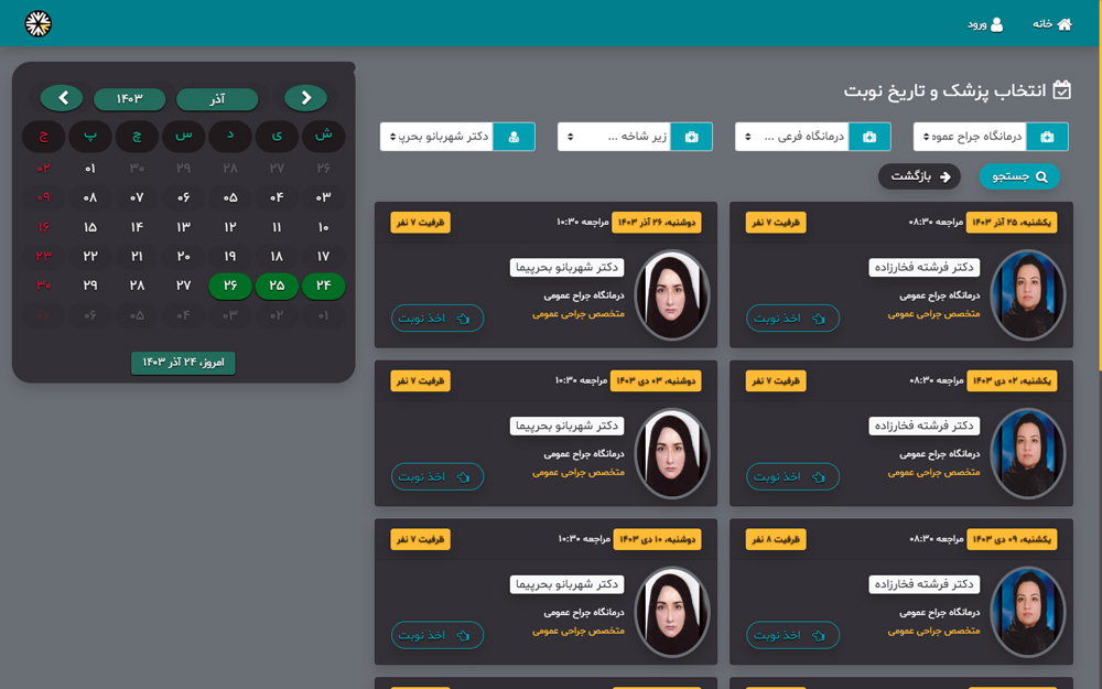 4 _ با توجه ظرفیت های موجود، تاریخ مورد نظر خود را برای پزشک مربوطه انتخاب و دکمه "اخذ نوبت" را بزنید.