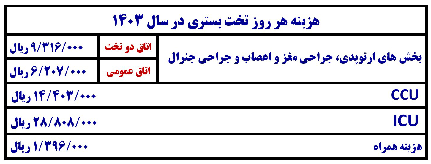 ضمناً: حداقل هزینه یک روز بستری در تخت بدون احتساب مانیتورینگ، دارو، ویزیت، مشاوره پزشکان، آزمایشات و گرافی ها ... در بخش ها به قرار زیر است: